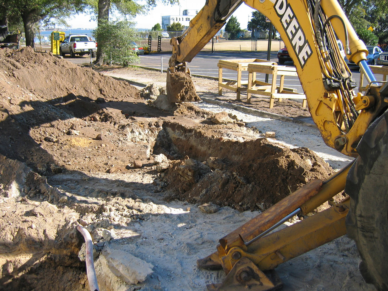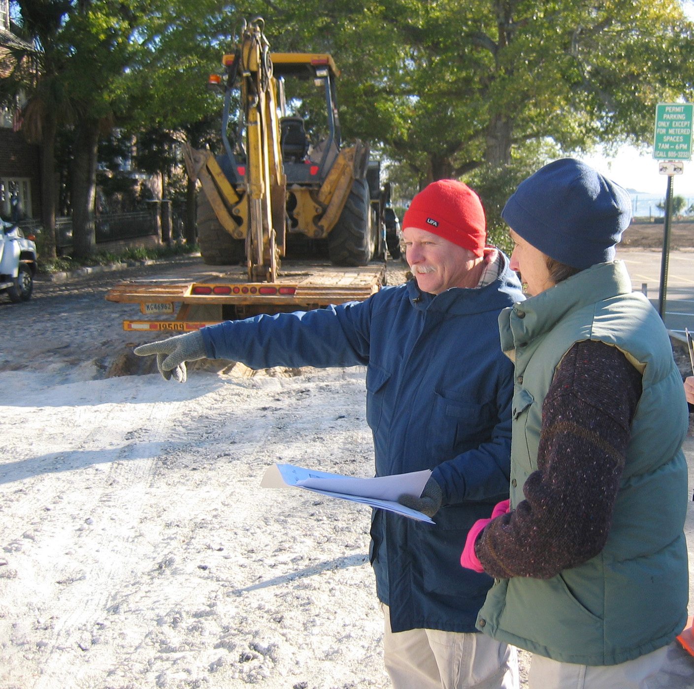 Members of the Mayor’s Walled City Task Force gathered at South Adger’s Wharf (SAW) this morning at 9 a.m. for a chilly start of the long-anticipated archaeological dig. Under the direction of archaeologists Eric Poplin (of Brockington & Associates) and Martha Zierden (of the Charleston Museum), the well-skilled backhoe operators from Charleston Water System initiated the dig with a narrow north-south trench from the northern edge of the site.