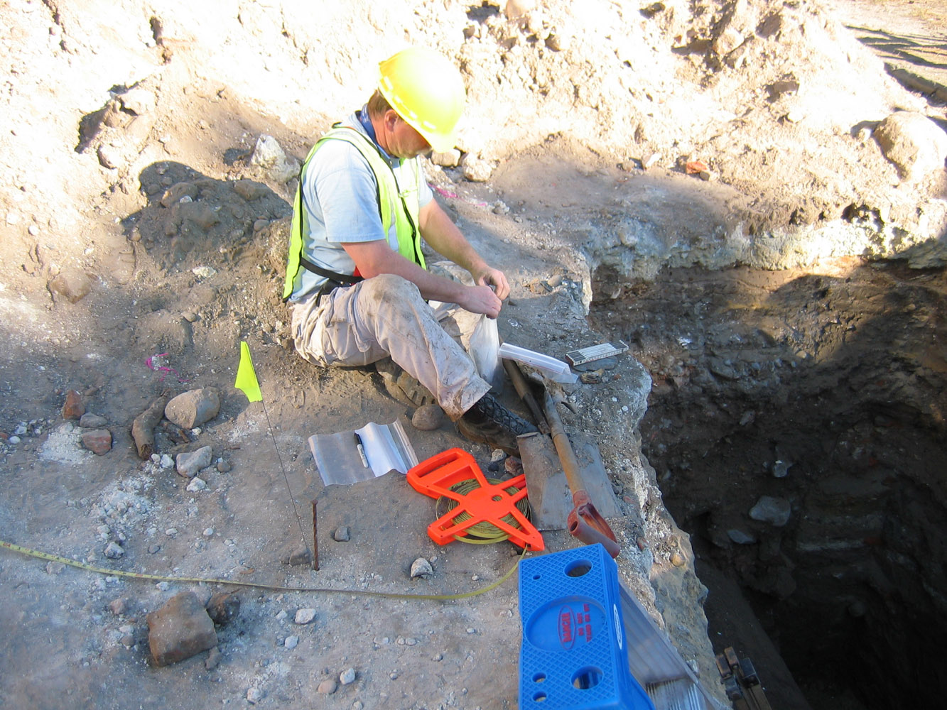 In a dramatic contrast to the frigid weather conditions experienced last week, everyone working at the South Adger’s Wharf dig today found themselves shedding layers of clothing and reaching for the sunscreen. The warm temperatures and bright sun helped create an energetic work site, and progress was made in three main areas today.