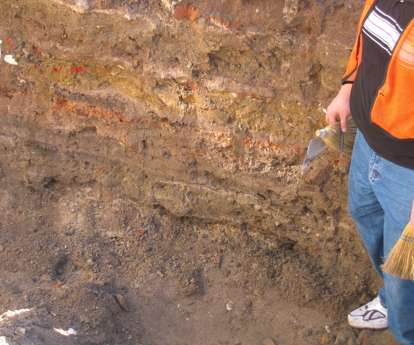 First, archaeologists Martha Zierden and Ron Anthony from the Charleston Museum, joined by and Andrew Agha from Brockington and Associates, used hand trowels to clean up the east face of the initial trench created on Thursday, January 3d, in order to examine and document the many visible layers. Understanding the various colors and textures of these layers is crucial, and with further study they will help the archaeologists to identify and date the many episodes of fill that created the modern street bed.