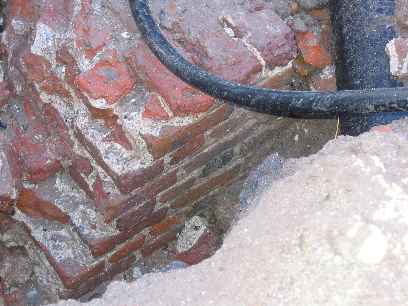 Once the mud was cleared away from the redan, we were able to get a good look at it for the first time. Even though the uppermost, above-ground mass of the redan was demolished about 1785, the remnants, located only about three feet below the modern street level, are five feet wide and composed of solid brick. The inner or westward face of the redan, seen in the photo to the left, presents a flat and uniform surface, and is laid in English bond pattern.