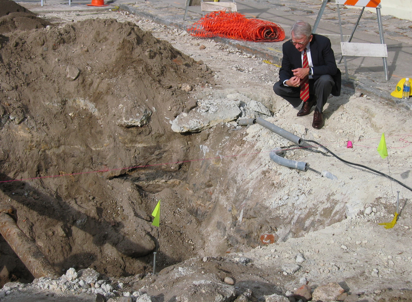 About mid-morning Charleston’s mayor, Joseph P. Riley Jr., paid an executive visit to the site. Katherine Saunders, co-chair of the Walled City Task Force, provided a brief tour, and archaeologist Martha Zierden explained some of the interesting features uncovered so far. Mayor Riley’s keen interest in Charleston history led to the bulk of the funding for this excavation and we owe him a great debt of gratitude. We certainly hope that the enthusiastic public support for this work and the substantial amount of scientific data recovered at South Adger’s Wharf will be sufficient dividend for the city’s investment.