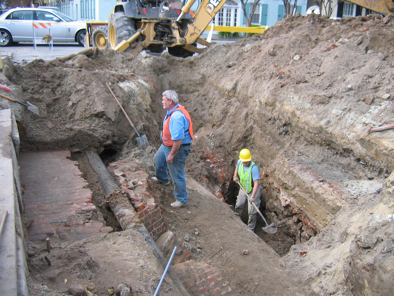 One of the top priorities for today’s activity at the South Adger’s Wharf dig was chasing the northwestward continuation of the brick redan to the point where it connects with the brick curtain wall along East Bay Street. Under the watchful eye of archaeologists Eric Poplin and Ron Anthony, the backhoe scooped out more fill until the top of the redan was seen, and then the shovel work began. After an hour or so of hand digging, the archaeologists uncovered the continuation of the five-foot wide brick redan. As expected, it lies in a northwest diagonal line, and is located on the northwest side of a four-foot wide brick drain (probably dating from the 1850s) that slices directly through the remnants of the redan.