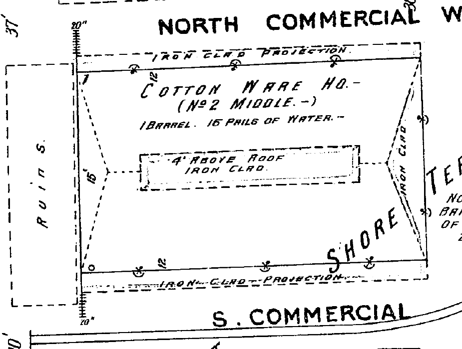 The brick building dates from the early years of the twentieth century, and is built on the site of a slightly larger three-story commercial structure that stood for most of the nineteenth century. An image of that building, from the 1884 Sanborn Insurance Map of Charleston, is seen above left. The 1902 edition of the Sanborn map of Charleston shows only “ruins” of this building, as seen here to the right.