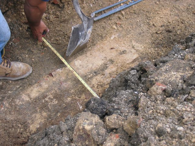 The exposed portion of brick was approximately two feet wide, but the full width of the wall could not be determined. At any rate, Katherine and I concluded that this brickwork most likely represents the foundation of the eastern wall of the nineteenth century commercial offices that once stood in front of the cotton warehouses and wharves of the Commercial Cotton Company.