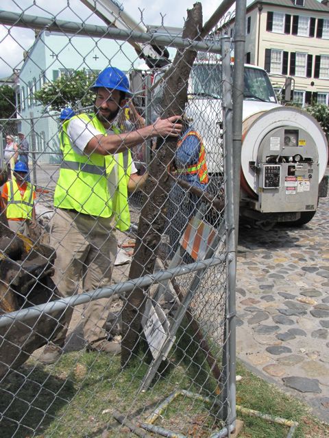Which brings us to our final point of the day. These wooden piles are precious historic objects that tangibly connect us to Charleston’s distant past, but they’re also composed of organic materials that will rapidly decay now that they have been removed from their “home.” The several professional archaeologists on hand today talked amongst themselves in an effort to make some decisions about the future of these piles, and also consulted with visiting conservation experts from the Hunley conservation laboratory. The short answer is this: It will cost several thousands of dollars to conserve the piles—perhaps as much as $10,000 for permanent conservation of two of the nine extracted from the colonial-era mud today. By Friday morning, June 26th, we will have to decide whether to put some or all of the piles back in the pit to be reburied, or to keep only one or two to be conserved and displayed at the Charleston Museum. Money is scarce all around for such projects, but we hope some folks in the community will lend some financial assistance in this matter.