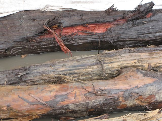 I can mention three significant features about these piles. First, they’re all roughly seven feet in length and just over a foot in circumference. Second, their bottom ends have been shaped with an ax into a crude but effective point, as seen in the photo above center. Third, the majority of the nine piles we recovered today are native cypress timbers, as you can see in the photo above right left of the newly-rinsed piles soaking in their protective shallow bath. In this same photo, however, you can clearly see that the pile at the top of the image is red cedar. Even after 300 years, they still look nearly as fresh as when they were harvested from a local forest.