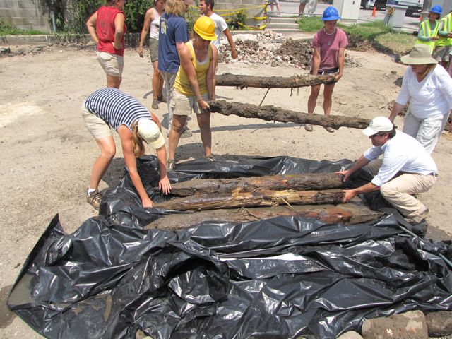 Immediately the several professional archaeologists on hand realized that they needed to begin to protect these 300-year-old organic objects from being damaged by exposure. Remember that they’ve been soaking in water, protected from everything, including oxygen, for more than 200 years. Loose ballast stones (extracted today from the same mud) were quickly gathered and arranged into long rectangles on the ground, then covered with plastic sheeting. One by one the water-logged timbers were placed in these makeshift baths, rinsed with a hose, and covered with water (see the photo at left). Once that frantic activity was accomplished the archaeologists and College of Charleston archaeology students began studying and measuring them.