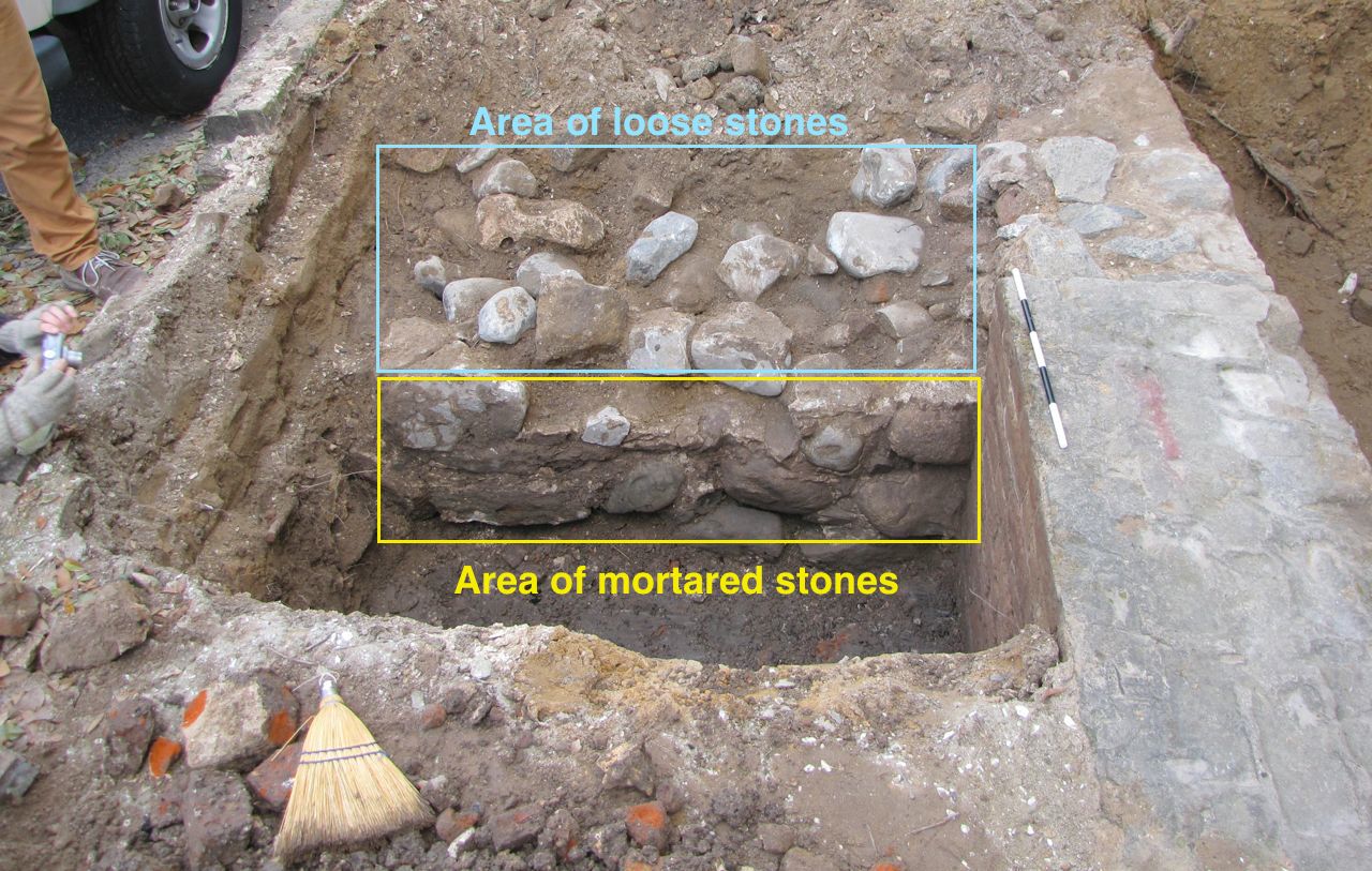 The object in question is a linear structure that follows a roughly north-south axis along the east side of East Bay Street in urban Charleston. The name “curtain wall” is a modern mash-up of earlier terms. The earliest records of its existence describe the feature as a “wharf wall” because it was associated with the creation of the linear “wharf” along Charleston’s Cooper River waterfront that became East Bay Street (see Episode No. 180). In the early years of the eighteenth century, locals frequently called it the “front wall” because it served as the easternmost part of a growing network of defensive fortifications surrounding the town. Starting in 1720, locals began describing this front wall using the standard military term “curtain line”; that is, a linear feature forming a defensive link between a series of gun batteries.