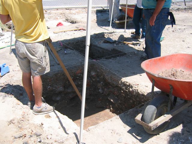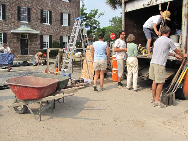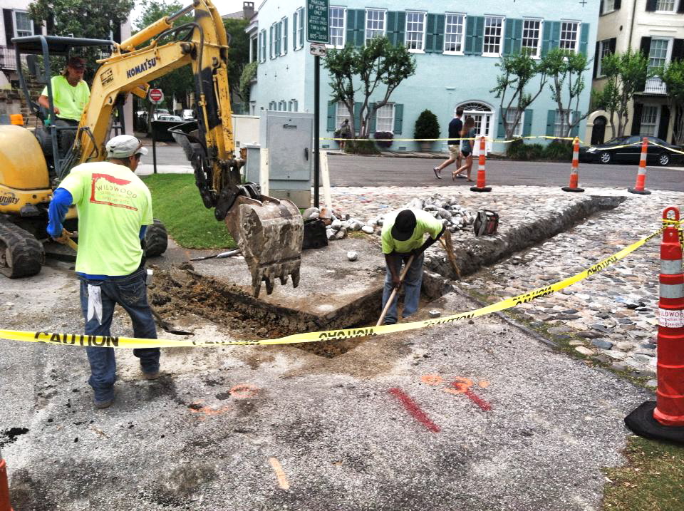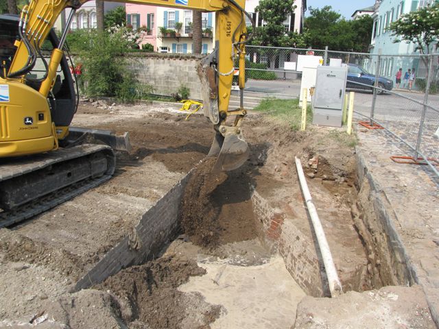 This morning the Walled City Task Force began a brief exploratory dig at the southeast corner of King and South Battery Streets, and we found some interesting materials. Did we find physical evidence to confirm the existence of the 1769 sea wall built of Bermuda stone and brick? Well, maybe. It’s a long story, and it’s going to take us a while to sort out the evidence and draw conclusions.