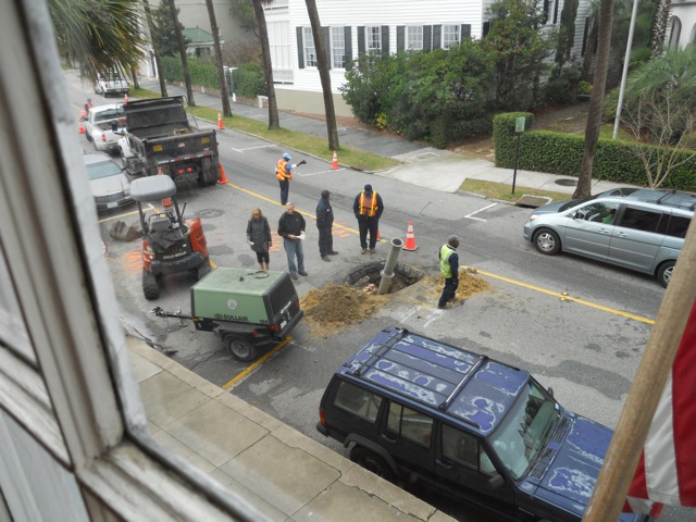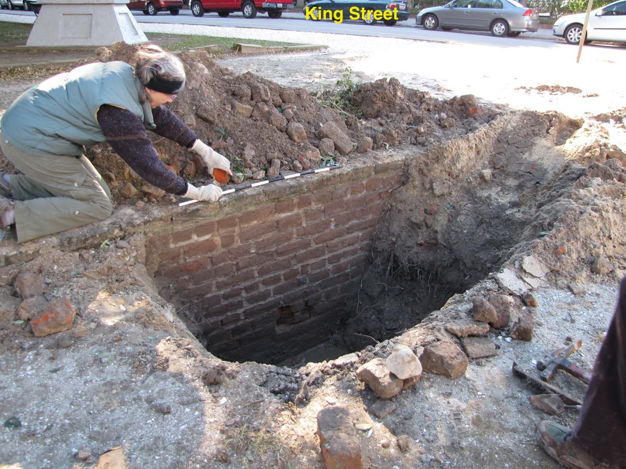 This morning the Walled City Task Force began a brief exploratory dig at the southeast corner of King and South Battery Streets, and we found some interesting materials. Did we find physical evidence to confirm the existence of the 1769 sea wall built of Bermuda stone and brick? Well, maybe. It’s a long story, and it’s going to take us a while to sort out the evidence and draw conclusions.