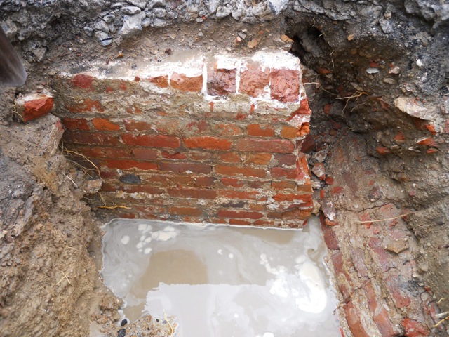 Could it be that this section of the 1769 brick sea wall was also rebuilt ca. 1811, but with brick rather than stone? The determining factor in this question might be the presence or absence of Bermuda stone at the base of the brick work. Since the bottom course of bricks was actually below the water level, we couldn’t see what was there. A tactile investigation (that is, reaching into the mud) found only coarse silt and vague fragments, which might actually represent the remnants of degraded Bermuda stone (which is soft when under water and hardens only when exposed to dry air). In short, we’re not sure of the date of this construction.