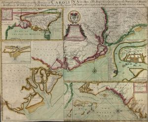 The “Crisp Map” is actually a large-format (82 by 99 cm), multi-image map that was published by Edward Crisp in London in 1711. Actually, it was published without a date, but historians have studied the names and features on the map and determined beyond doubt that it was published in 1711 (certainly not 1704). As you can see in the image below, the map bears a long title: “A Compleat Description of the Province of Carolina in 3 Parts. 1st. The Improved Part from the Surveys of Maurice Mathews & Mr. John Love. 2ly. The West Part by Capt. Tho. Nairn. 3ly: A Chart of the Coast from Virginia to Cape Florida. Published by Edwd. Crisp.”