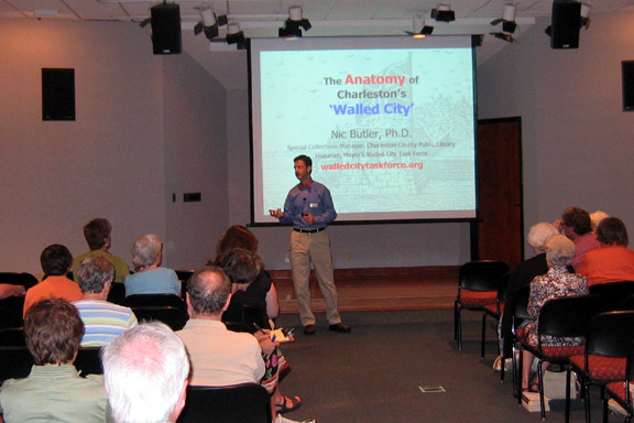 On 30 January 2008 the Mayor’s Walled City Task Force presented an illustrated overview of the recent archaeology at South Adger’s Wharf. Well over a hundred people came to the Charleston County Public Library’s auditorium to hear about the dig from several of the participants.