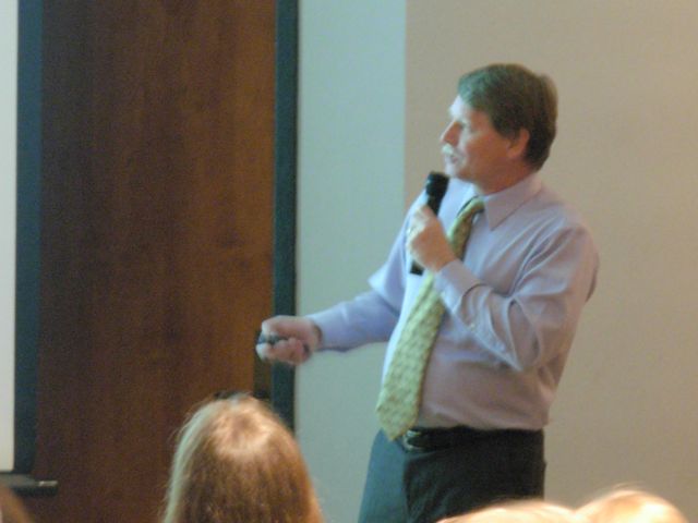 Charleston Museum curator of archaeology Martha Zierden took the stage to discuss the collection and curation of artifacts from the recent dig. In addition to her slides and narration, Zierden and her colleague Ron Anthony brought a large number of pottery sherds, bone fragments, and other materials collected from the site. At the conclusion of the program, audience members were invited to crowd around the display table of artifacts and chat with the archaeologists.