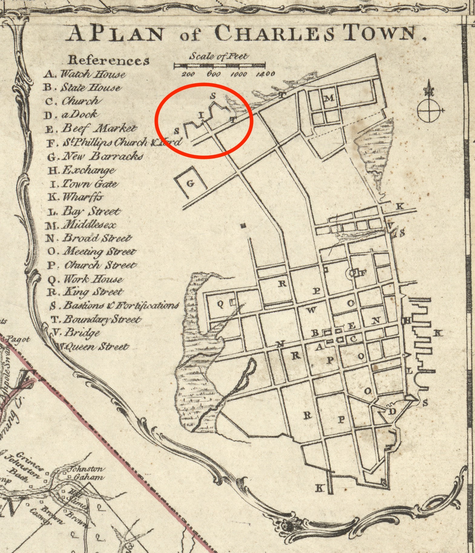 Last week I provided an overview of a neglected fortification called the Horn Work that once straddled King Street along the northern edge of colonial Charleston. Having already described the highlights of that structure’s general design, materials, and dimensions, I’d like to segue into a more detailed investigation of its construction in the late 1750s. That era marked the final phase of a long series of fortification projects in urban Charleston that stretched back to the 1670s. Time doesn’t permit a full recital of the several construction campaigns leading up to the 1750s, but a brief synopsis of some of that material will help set the stage, so to speak, for the rise of the Horn Work and help us appreciate its role in our community’s long history.
