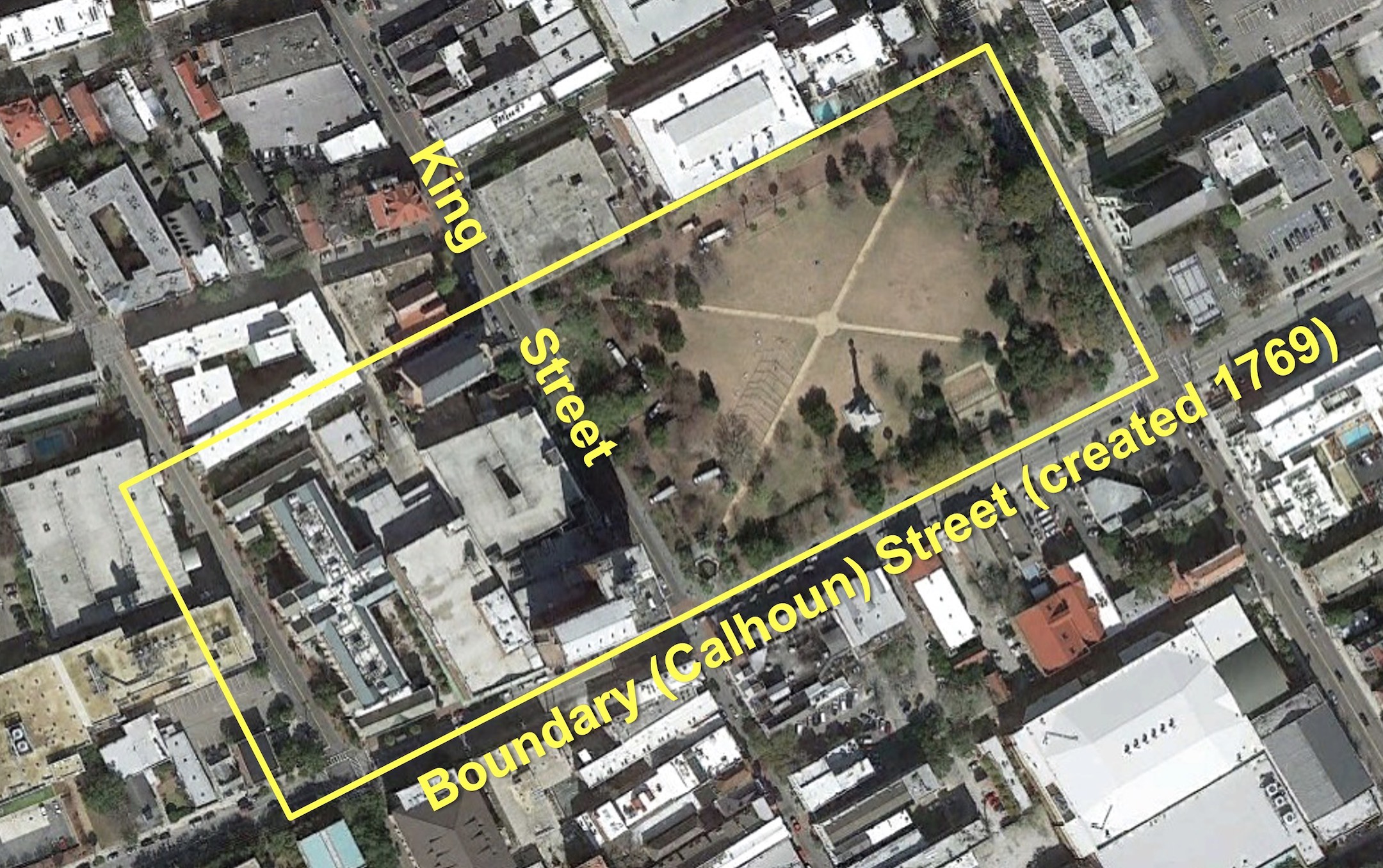 Horn_Work_looking_northeast_2008Marion Square is Charleston’s most popular public gathering space, but few visitors recognize one of the city’s most valuable historical treasures within the park. Behind a modest iron railing located approximately 125 feet east of King Street stands a mysterious slab of gray, concrete-like material. It stands approximately six feet high, is nearly ten feet long, and just over two feet wide at its base. A small metal plaque affixed to the railing is inscribed with a few disjointed words: “Remnant of Horn Work. May 1780. Siege of Charleston.” This brief text, installed in 1883, has provided little to inspire the imagination of successive generations of tourists and locals, who often pass the familiar object without a second look.