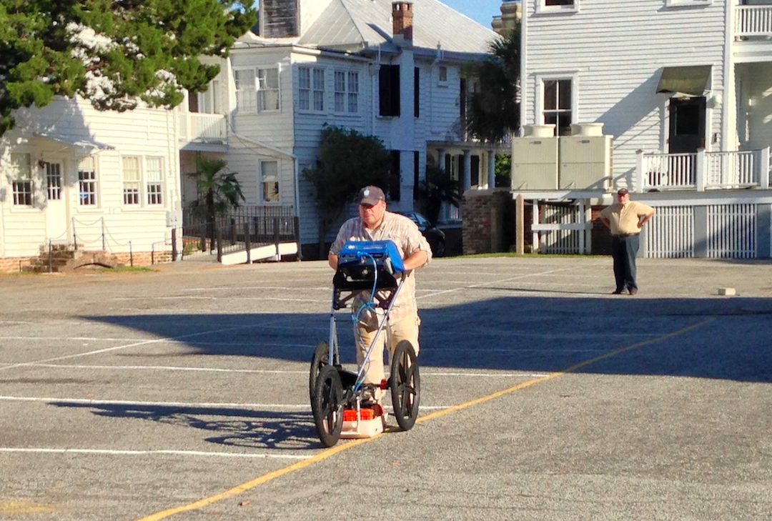 With permission from the kind folks at First Baptist Church, we created a temporary grid of approximately twenty by twenty-five meters of uninterrupted space in the asphalt-paved parking lot.  We could have done a slightly larger area, but our efforts were restricted by time, a large storm water drain, and an errant parked vehicle.  Jon used a 400 MHz GPR antenna, which is capable of “seeing” a few meters deep, but in our sandy soil the resolution is a bit compromised.